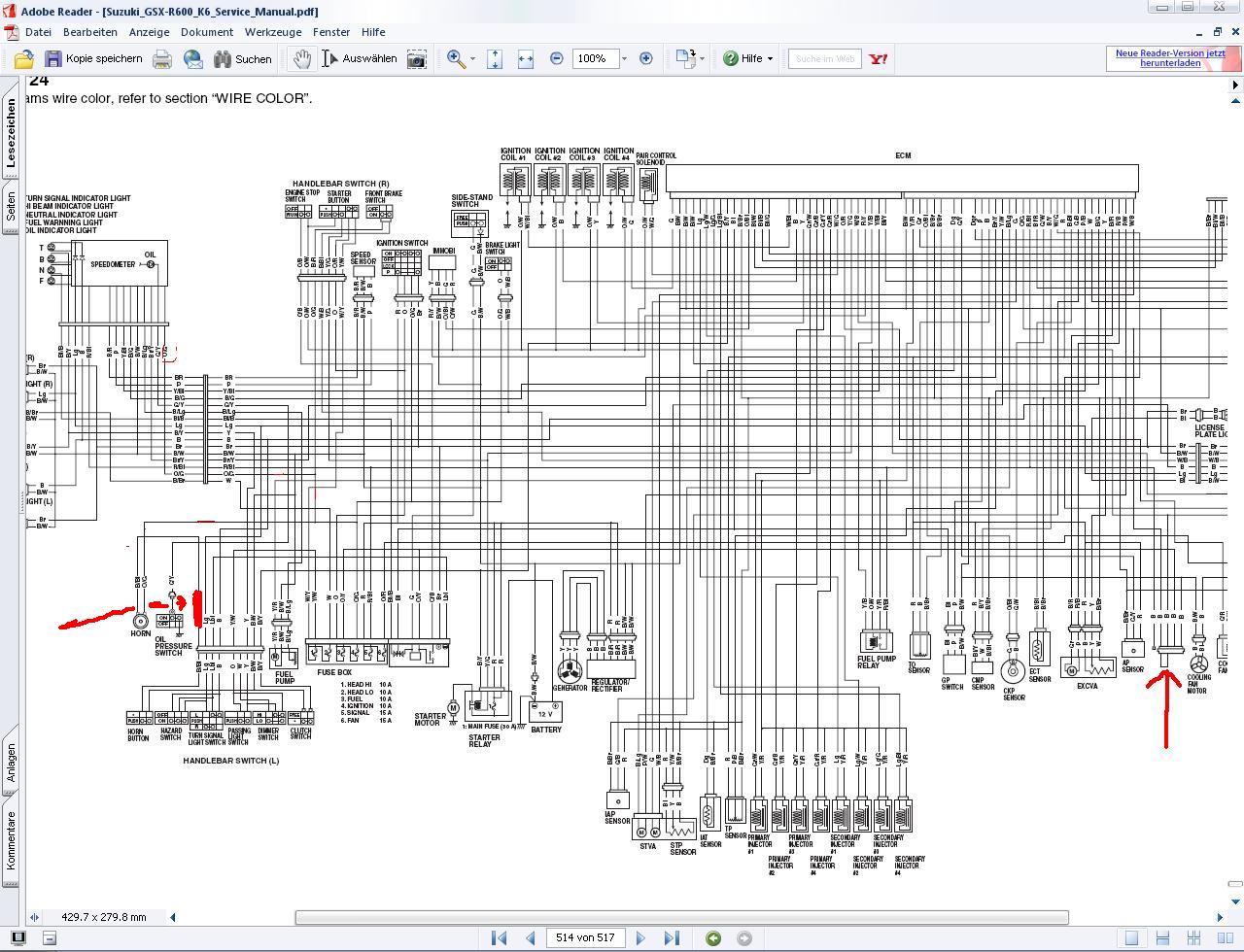 Jetzt sagen die, dass man das eine Kabel an das Plus der Hupe anklemmen soll, da die Hupe ne eigene Sicherung hat! Und das Minus iergendwo am Rahmen... Hab heute mal am linken Lenker die Elektronik aufgemacht nur weiss ich jetzt nicht welches das Plus Kabel von der Hupe ist^^ Und wisst ihr einen Punkt wo ich das Minus anklemmen soll? Das eine Kabel ist Schwarz und das andere Schwarz/Weiss. Hat vielleicht einer nen Schaltplan der K6?