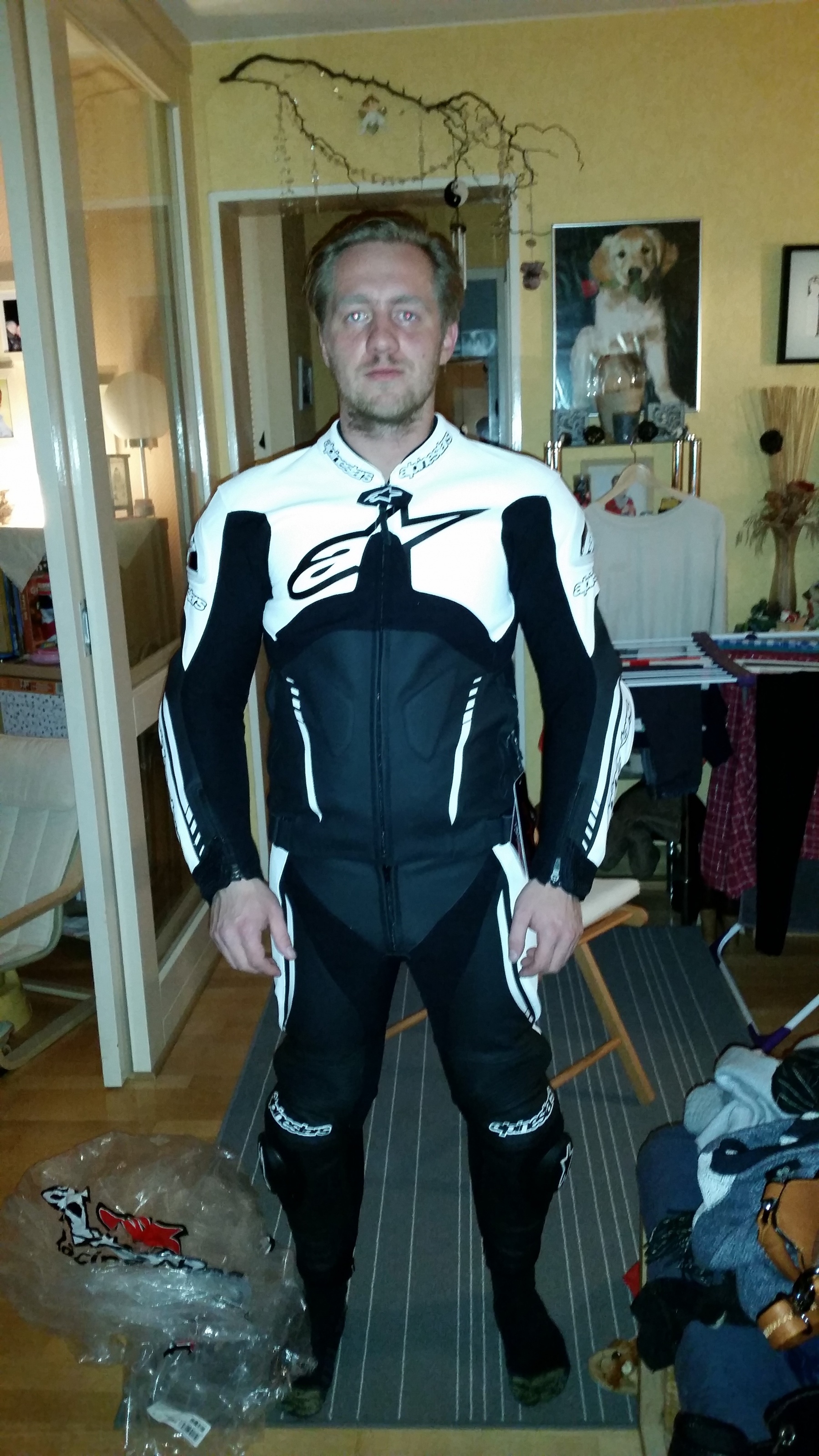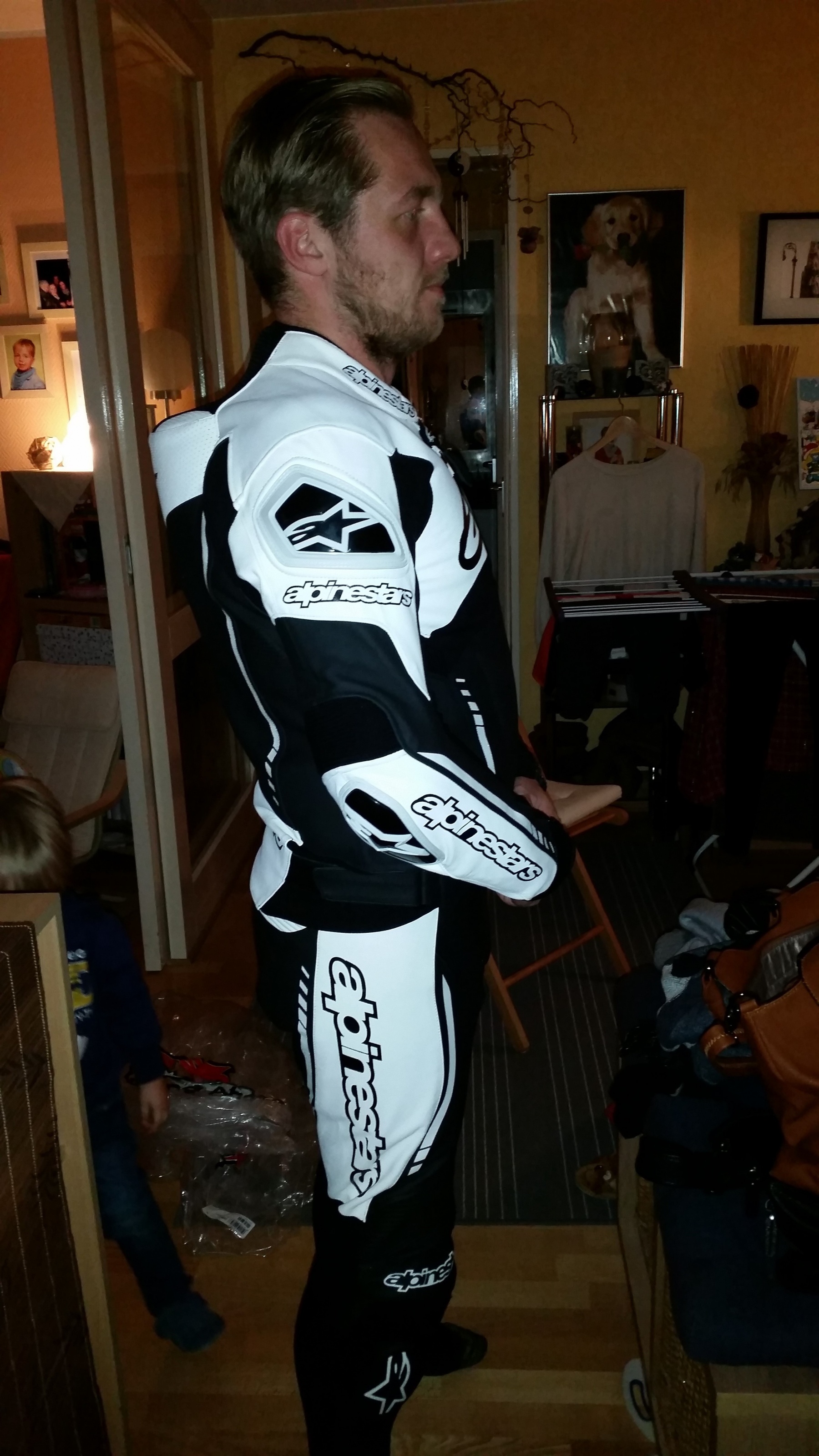 Ich hab meine erste kombi in schwarz/weiss gekauft lederkombi von tschul 727er da es der einzige shop war der zu gutem preis die jacke in grösse 56 und hose in 52 verkauft hat.der anzug passte wie angegossen,anfangs war er bisschen eng aber nach 2-3mal tragen sitzt er einfach perfekt genau so wie es sein soll.